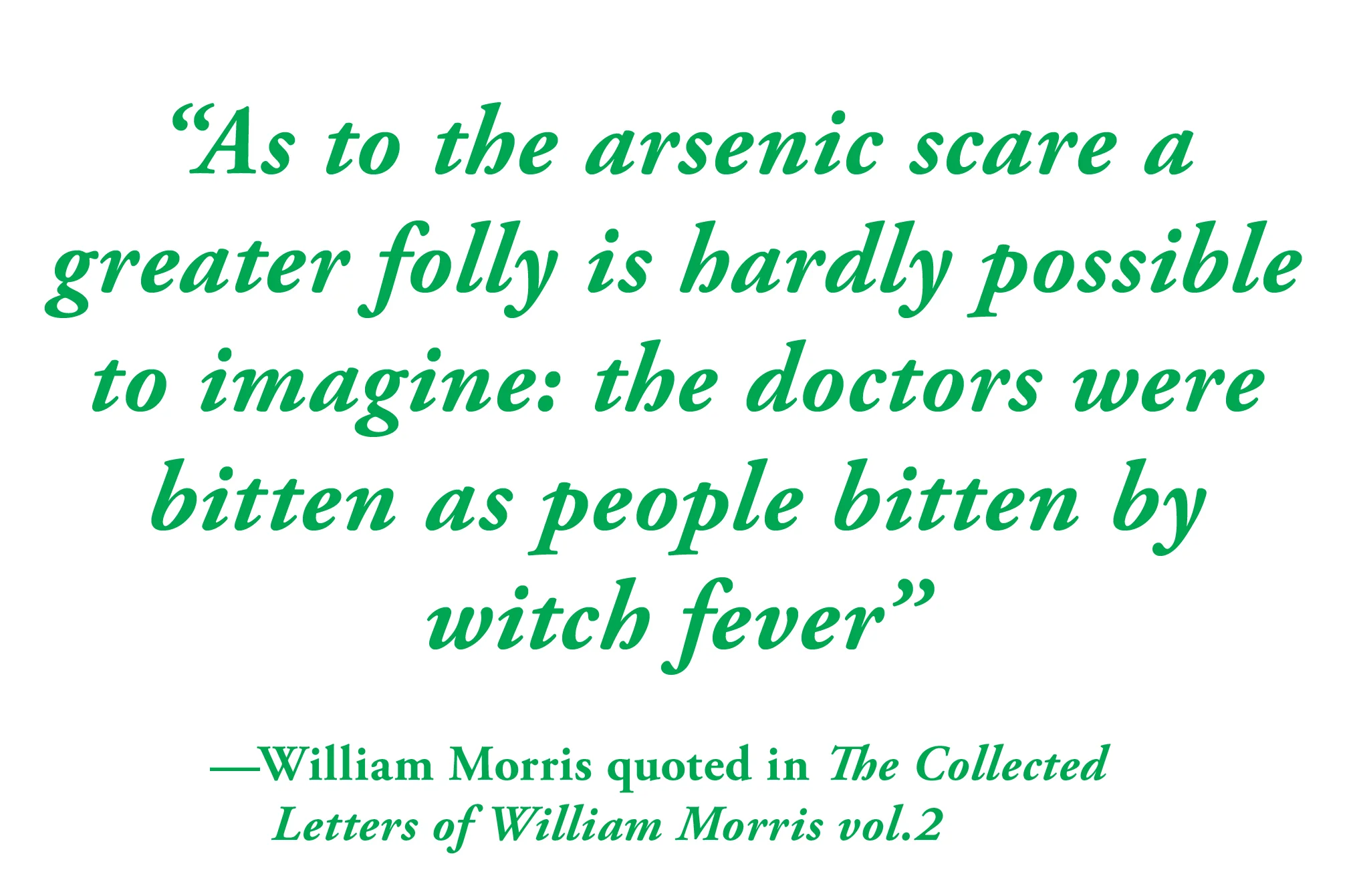 By the end of the 19th century, it was widely accepted that arsenic wallpapers were hazardous, yet many countries were slow to ban them. It was big business; in Britain alone, it was estimated that there was 100-million square miles of it. In addition to Scheele's Green, other colours utilized arsenic to make vibrant colours. The potential loss of revenue had some wallpaper manufacturers offering to eat pounds of their product to prove it was not harmful. William Morris (a highly influential figure in design history associated with the British Arts & Crafts Movement) referred to the anti-arsenic reports as a foolish scare. His response is perhaps not that surprising considering Morris happened to own shares in his Father's Arsenic mine in the 1870s. Nonetheless, a society once infatuated with Scheele's Green grew to fear it. For the most part, it was the public's own boycotting of arsenic pigments that eventually convinced manufacturers to produce arsenic-free alternatives.